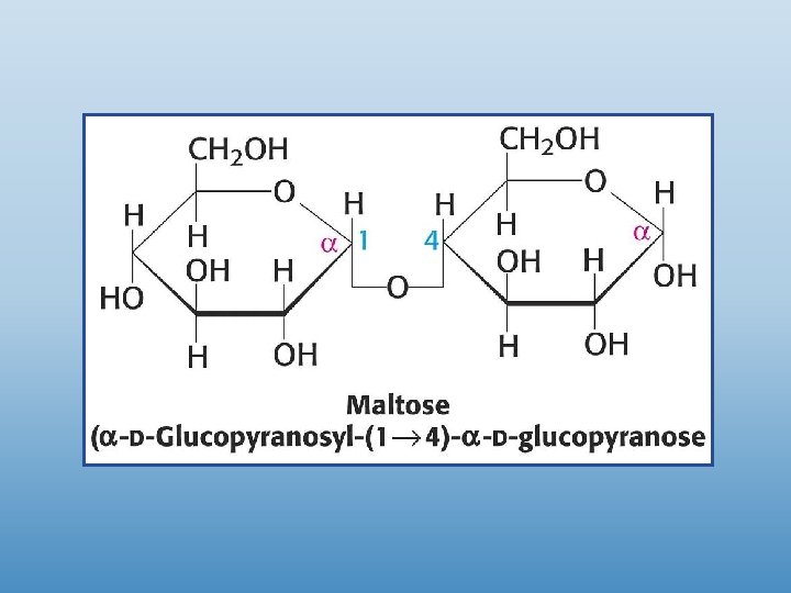Características Exhibe mutarrotación Es un azúcar reductor. Enzima que la hidroliza MALTASA. Formada por 2 moléculas de glucosa. Enlace glucosídico 1 - 4 D-Glucopiranosa + D-glucopiranosa (Glucosa) + (Glucosa)