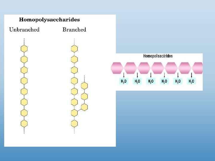 POLISACÁRIDOS HOMOPOLISACÁRIDOS Y HETEROPOLISACÁRIDOS. Los homopolisacáridos son polisacáridos formados por un mismo tipo de azucar simple, unidos mediante enlace O-glucosídico, similar al visto en disacáridos, con pérdida de una molécula de agua por cada enlace. Tienen pesos moleculares muy elevados, no poseen poder reductor.