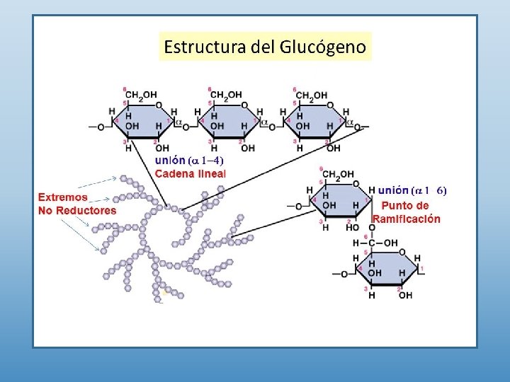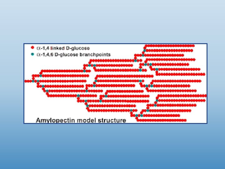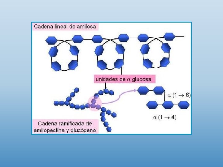 AMILOSA: Es una cadena helicoidal continua de unidades de D-glucosa unidas por enlaces glucosídicos 1 -4. AMILOPECTINA: Cadena ramificada lineal de unidades de glucosa que poseen enlaces glucosídicos (1 -4) como (1 -6) a esto se debe sus ramificaciones. (Ramificaciones cada 25 unidades de glucosa).
