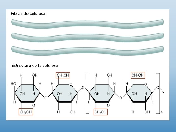 Celulosa: homopolisacárido estructural constituye la pared de las células vegetales. Son cadenas lineales. Posee enlaces glucosídico beta 1 -4. Glucosa-Glucosa.