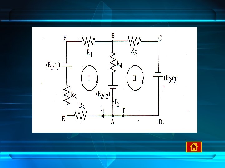 loop I = ABFEA -E 1 -E 2+I 2(R 4+R 2)-I 1(R 3+R 1+R 2) = 0 loop 2= ADCBA E 3 + E 2 - I(R 5+R 3) - I 2(R 4+R 2) = 0 Dengan cara eliminasi dua persamaan didapatkan besaran yang dicari