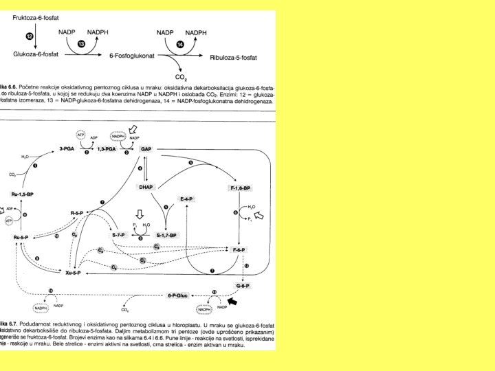 OKSIDATIVNI PENTOZNI CIKLUS - direktna oksidacija glukoze je alternativan put za oksidaciju ugljenih hidrata - sastoji se iz dvije faze: - oksidativne (koja je ireverzibilna) i - reverzibilne faze koja obuhvata metabolizam pentoza - ovaj proces se obavlja u citosolu i u hloroplastima u mraku (na svjetlu reduktivni pentozni ciklus, a u mraku niz reverzibilnih reakcija koje predstavljaju oksidativno pentozni ciklus)