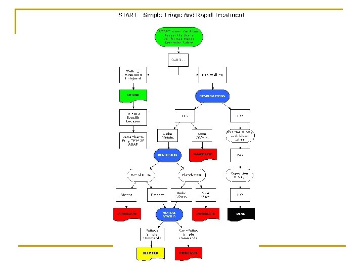 Simple Triage And Rapid Treatment ( START) n n system to triage multiple victims in 30 seconds or less based on three primary observations (RPM): q q q Respiration Perfusion Mental Status