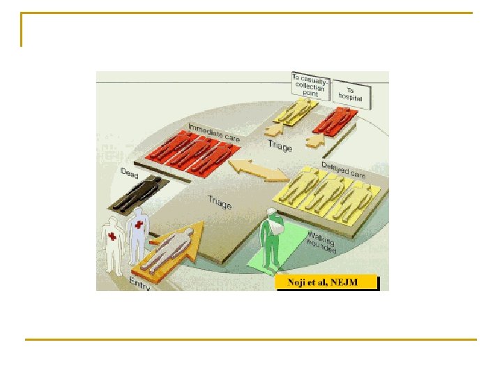 TRIAGE n n French word for SORT Concept of triage: q Method of quickly identifying victims: n n who have immediately life-threatening injuries who have the best chance of surviving