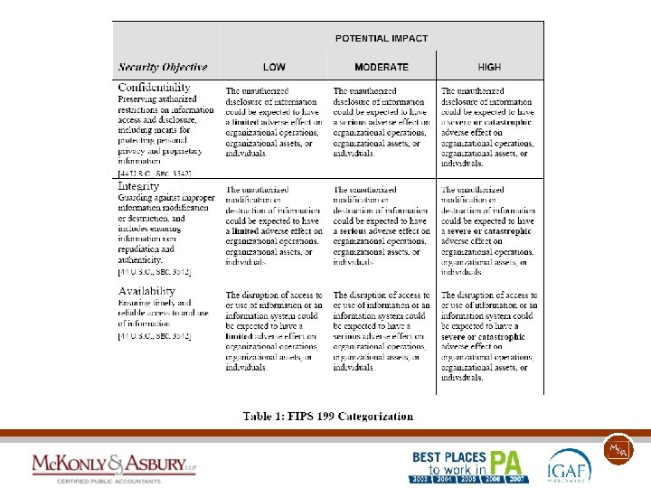 FISMA Summary • FISMA is about information security and a formalized process to attest to the security • The process flow is standard audit framework. • NIST provides clear guidelines on how to document and proceed. • Check out: http: //csrc. nist. gov/groups/SMA/fisma/index. html