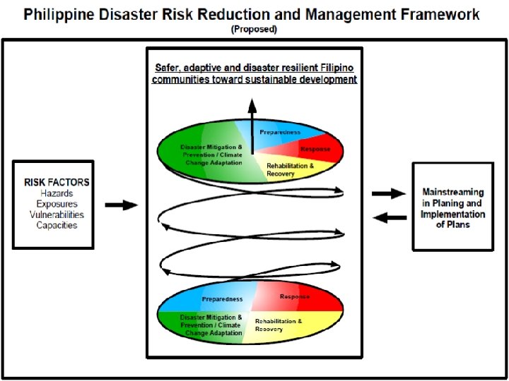 4. Education on DRRM and CCA for ALL education through the integration of DRR concepts in the curriculum (i. e. , basic education, NSTP, bachelors’ degree) and for the public sector employees 5. Institutionalization of DRRMCs and LDRRMOs 6. Mainstreaming of DRR in ALL plans In all 4 aspects, we need to ensure that DRRM (and CCA) is mainstreamed in the various programs, plans, projects of either national or local government units, including the private sector groups and other members of the community.