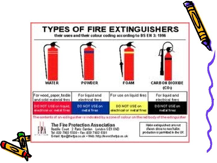 Know your fire extinguishers 1) Pressurized Water – 2 ½ gallons – – Range : 30 -35 feet To be used on class A fire (wood, paper, trash, bedding, etc. ) 2) Carbon-di-oxide – – – 5 -15 lbs Range: 4 -6 feet To be used on class B fires (flammable liquids) and on class C fires (Electrical)