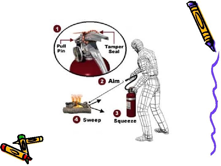 Disaster due to fire • In deciding to fight a fire, you need to determine a few things: i) If there is a fire extinguisher with the proper fire rating and classification available ii) The size of the fire; anything more than a wastebasket is probably too large iii) The amount of firefighting ability needed to address the situation. If you are not completely confident, close the door to the fire area and evacuate. iv) Fourth, Remember the Acronym P. A. S. S. – – Pull the Pin. Aim the Extinguisher nozzle at the base of the Fire. Squeeze the handle while holding the Extinguisher upright. Sweep from side to side covering the fire with extinguishing agent.