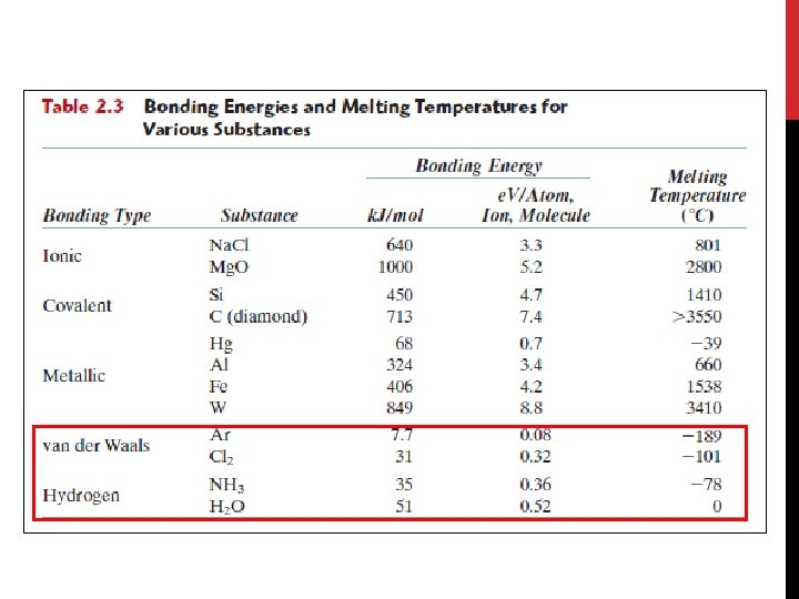 • Na figura anterior, o mínimo da curva de energia resultante corresponde ao valor de r 0. • A energia de ligação para esses dois átomos (E 0) corresponde à energia nesse ponto de mínimo. Ela represente a energia necessária para separar esses dois átomos até uma distância infinita. • Inúmeras propriedades dos materiais dependem do valor de E 0, da forma da curva e do tipo de ligação. Quais características da curva (E vs r) estão associadas a alto ponto de fusão; alta rigidez mecânica; alta expansão térmica?