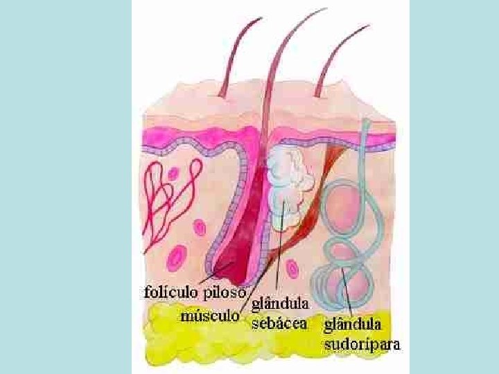 Principais Funções • Tato • Barreira contra infecção. • Auxilia a regulação da temperatura do corpo. • Remove produtos de excreção. • Proteção contra a radiação ultravioleta do Sol. • Produz vitamina D.