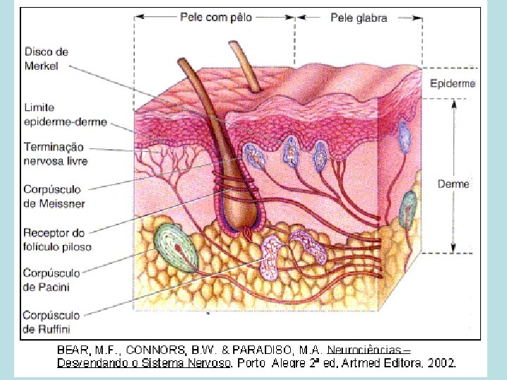 Receptores de Superfície Receptores de Krause Frio Receptores de Ruffini Calor Discos de Merkel Tato e Pressão Receptores de Pacini Pressão Receptores de Meissner Tato Terminações nervosas livres Principalmente Dor