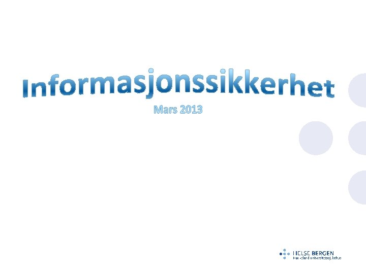 INFORMASJONSSIKKERHET • Konfidensialitet – Sikre at informasjon bare er tilgjengelig for de som skal ha tilgang • Integritet – Sikre informasjon mot utilsiktet eller uautorisert endring eller sletting • Tilgjengelighet – Sikre at informasjon er tilgjengelig ved behov, innenfor definerte krav • Kvalitet – Sikre at informasjon er korrekt, oppdatert, relevant og tilstrekkelig «Informasjonssikkerhet er ikke et mål i seg selv, men et middel for å oppnå tilfredsstillende kvalitet på virksomhetens tjenester»