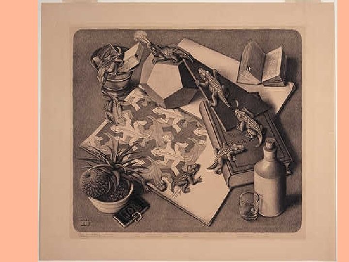 Escher makes us question reality. How can a mirror tilted upward reflect a street seen through a window on the opposite wall? E