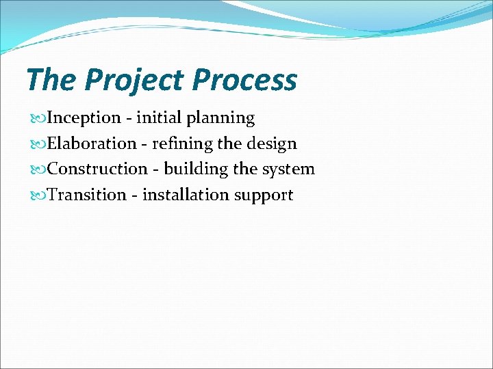 The Project Process Inception - initial planning Elaboration - refining the design Construction - building the system Transition - installation support