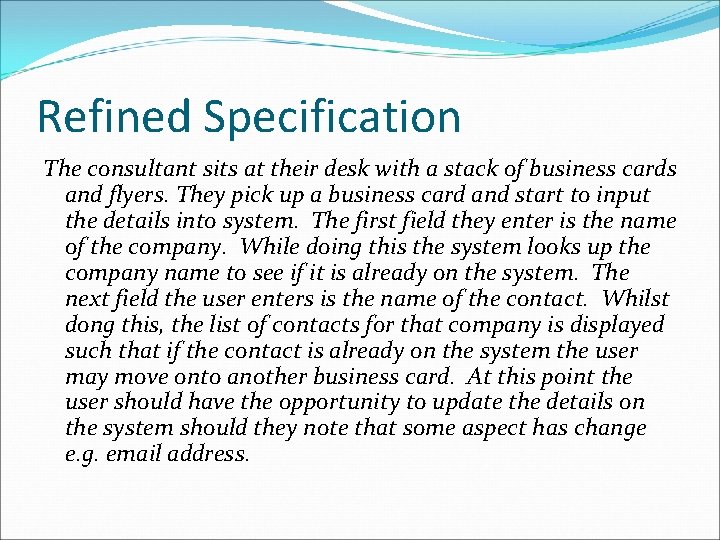 Refined Specification The consultant sits at their desk with a stack of business cards and flyers. They pick up a business card and start to input the details into system. The first field they enter is the name of the company. While doing this the system looks up the company name to see if it is already on the system. The next field the user enters is the name of the contact. Whilst dong this, the list of contacts for that company is displayed such that if the contact is already on the system the user may move onto another business card. At this point the user should have the opportunity to update the details on the system should they note that some aspect has change e. g. email address.