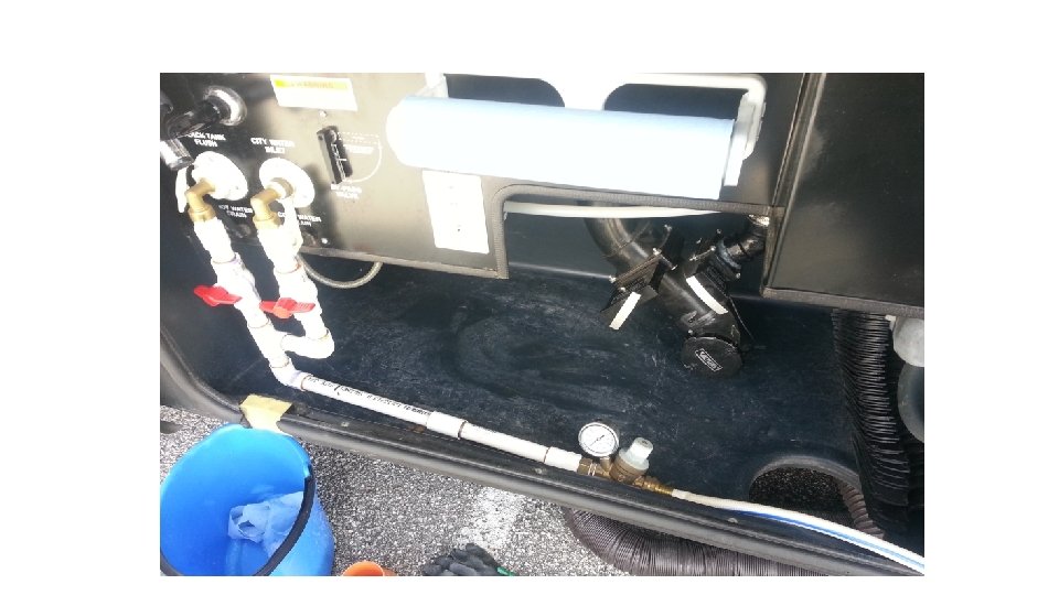 • Tip Number 1: • One hose is all that is needed for water into the coach. • How many water pressure valves have you forgotten at RV parks? • Constructed using 90 degree brass fittings and standard ¾ inch PVC pipe • 2 brass 90 degree fittings connected to black and fresh water connections • 2 valve connections for input water supplies • 1 check valve installed on black water line • Brass adjustable water pressure PSI valve with meter installed inside coach • 4 foot flexible water hose installed as primary connection point • Total cost – approximately $ 89. 00 ($65 for pressure valve)