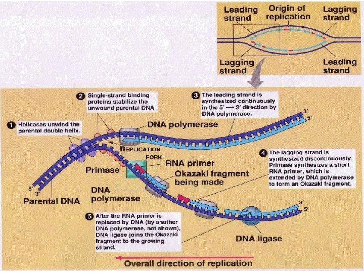 Replication Overall direction of replication 3’ 3’ 5’ 5’ Okazaki fragment 3’ 5’ Leading strand synthesis continues in a 5’ to 3’ direction. Discontinuous synthesis produces 5’ to 3’ DNA segments called Okazaki fragments.