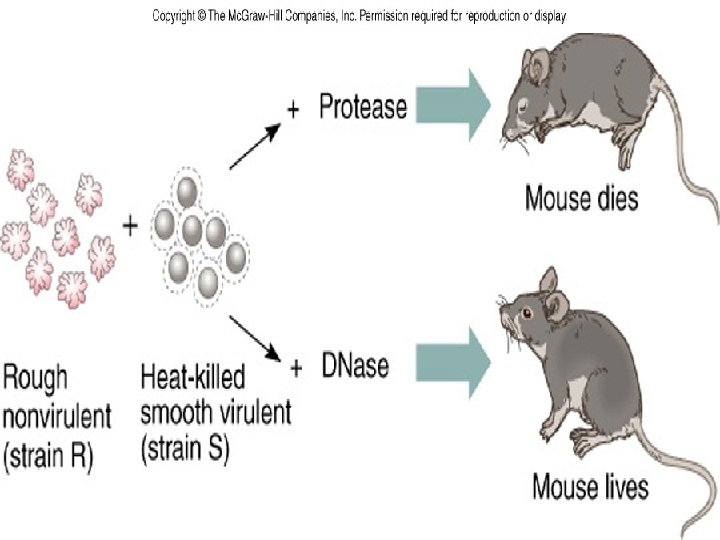 Discovery of a “transforming principle” Frederick Griffith, 1928 } Pneumonia (Diplococcus pneumoniae) infects mice. } Mice develop pneumonia and die. } Two types of bacteria: } R bacteria rough coat - no pneumonia } S bacteria smooth coat- pneumonia } } Coat type is associated with virulence.
