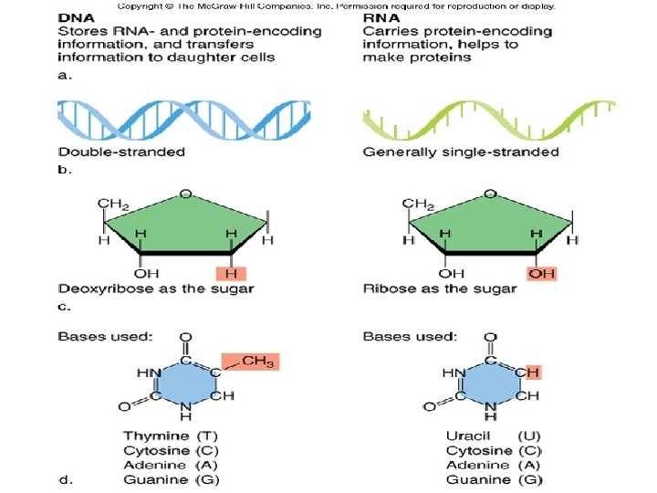 • RNA is also a nucleic acid RNA has a slightly different sugar RNA has U instead of T Nitrogenous base (A, G, C, or U) Phosphate group Uracil (U) Sugar (ribose) Figure 10. 2 C, D