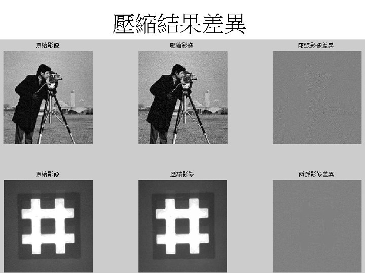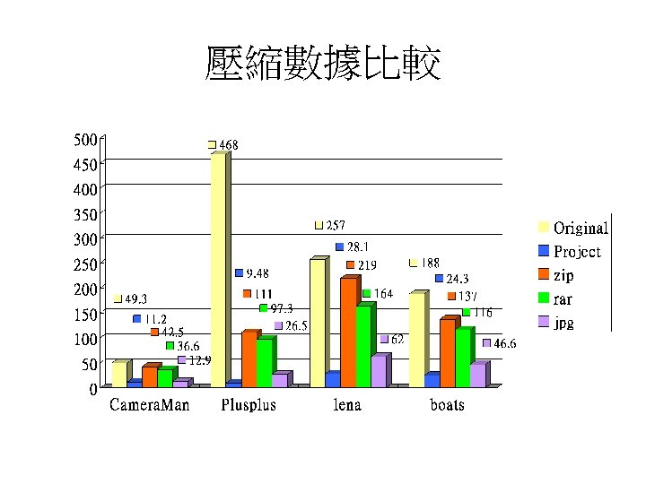 壓縮數據比較 原始檔案 Camera. Man Plusplus lena boats 原始大小 (壓縮比) 49. 3 KB 468 KB 257 KB 188 KB 壓縮格式 壓縮大小 ----------------- zip --------- 42. 5 KB (82. 61%) 111 KB (23. 72%) 219 KB (85. 21%) 137 KB (72. 87%) rar --------- 36. 6 KB (74. 24%) 97. 3 KB (20. 79%) 164 KB (63. 81%) 116 KB (61. 7%) jpg --------- 12. 9 KB (26. 17%) 26. 5 KB (5. 662%) 62. 0 KB (24. 12%) 46. 6 KB (24. 79) project --------- 11. 2 KB (22. 75%) 9. 48 KB (2. 024%) 28. 1 KB (10. 95%) 24. 3 KB (12. 93%)