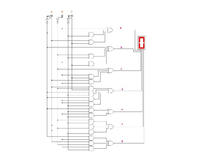 Applications of logic – 7 segment display project in 2 in 1 in 0 YOUR LOGIC out. A out. B out. C out. D out. E out. F out. G Note: A “ 1” on out. A turn on the A segment of the 7 segment display, and a “ 0” on out. A turns segment A off. The same is true for segments B through G