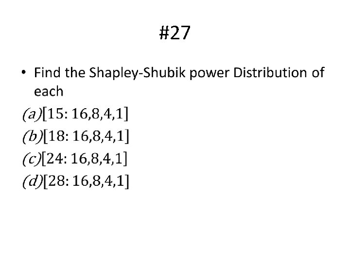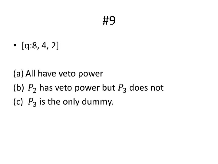 #7 • Is there any dictators, veto holders, or dummies (a) [15: 16, 8, 4, 1] (b) [18: 16, 8, 4, 1] (c) [24: 16, 8, 4, 1] P 1 D, all d p 3 p 4 d p 1 V, p 4 d, p 1 p 2 V,