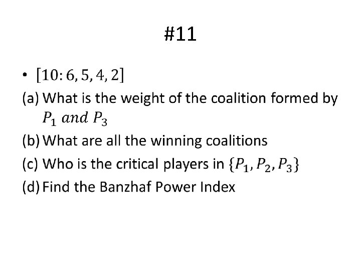 Lets look at Congress • 99 Republicans • 98 Democrats • 3 Independents • List the winning coalitions: Coalition Weight