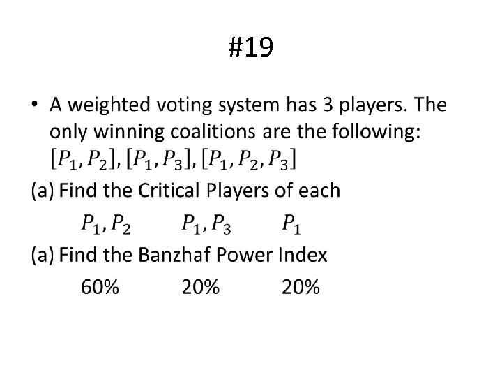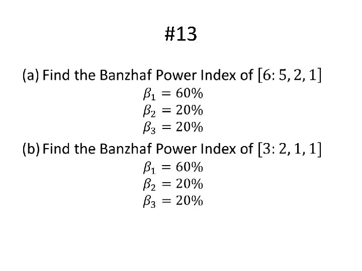 Where did Banzhaf come from • Nassau County District Weight Hempstead #1 31 Hempstead #2 31 Oyster Bay 28 North Hempstead 21 Long Beach 2 Glen Cove 2 • Find the Banzhaf Power Index of Nassau County