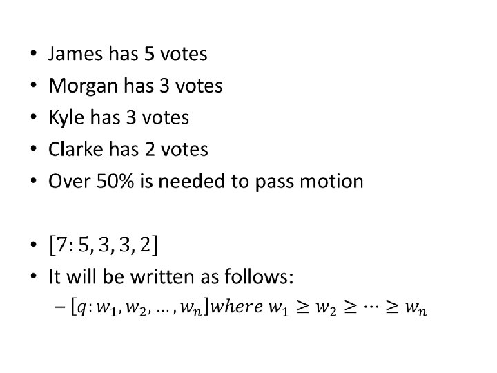 Words to know • Players: The voters in the weighted system • Weights: The number of votes each player holds • Quota: The minimum number of votes required to pass a motion