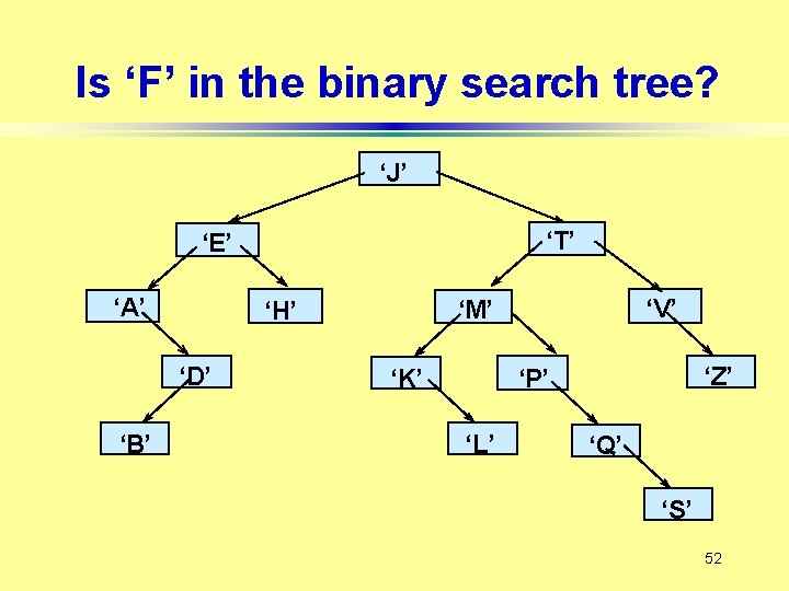 Another binary search tree ‘J’ ‘T’ ‘E’ ‘A’ ‘H’ ‘M’ ‘P’ ‘K’ Add nodes containing these values in this order: ‘D’ ‘B’ ‘L’ ‘Q’ ‘S’ ‘V’ ‘Z’ 51