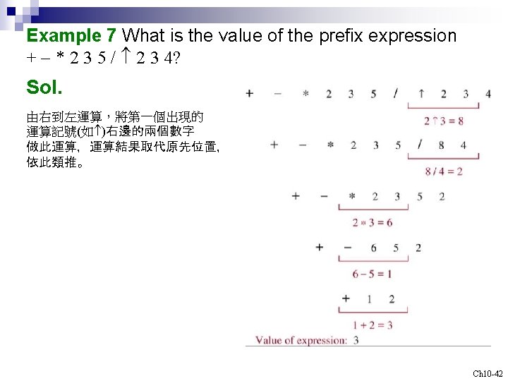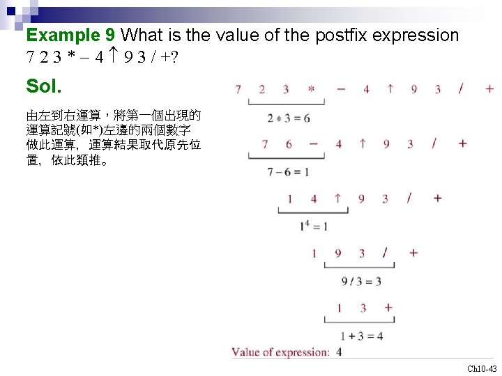 Example 6 What is the prefix form for ((x+y) 2)+((x-4)/3)? Sol. + +xy 2/-x 43 Example 8 What is the postfix form of the expression ((x+y) 2)+((x-4)/3)? Sol. x y+2 x 4 -3/+ Note. An expression in prefix form or postfix form is unambiguous, so no parentheses are needed. Ch 10 -41