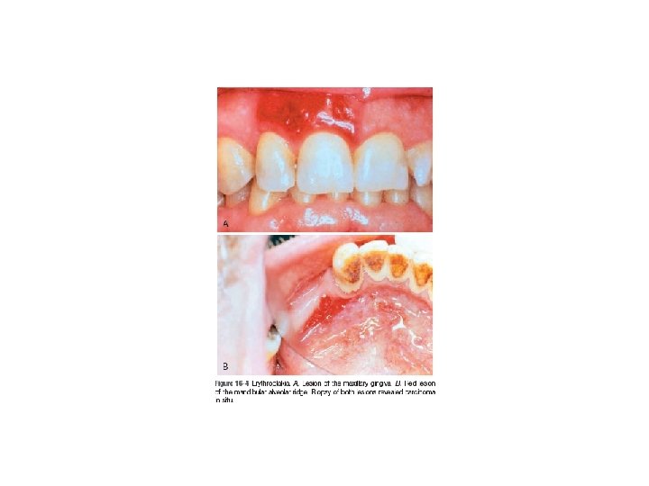 • - Erythroplakia: less common The risk of malignant transformation is much higher than in leukoplakia. The histologic changes in erythroplakia only rarely demonstrate orderly epidermal maturation; virtually all (approximately 90%) disclose severe dysplasia, carcinoma in situ, or minimally invasive carcinoma. Often, an intense subepithelial inflammatory reaction with vascular dilation is seen that likely contributes to the reddish clinical appearance. Speckled leukoerythroplakia: Intermediate forms that have the characteristics of both leukoplakia and erythroplakia.