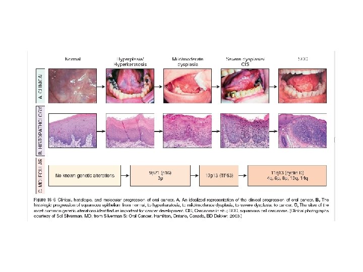 • Molecular Biology of Squamous Cell Carcinoma: Tobacco carcinogen induced cancers: mutations frequently involve the p 53 pathway as well as proteins responsible for the regulation of squamous differentiation, such as p 63 and NOTCH 1. HPV-associated SCCs: contain far fewer and different genetic alterations and typically overexpress p 16, a cyclindependent kinase inhibitor. expression of the HPV oncoproteins E 6 and E 7, there is inactivation of the p 53 and RB pathways