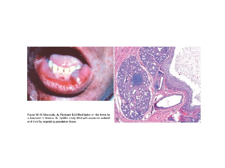 • Mucocele: - The most common type of inflammatory salivary gland lesion. - It results from either blockage or rupture of a salivary gland duct, with consequent leakage of saliva into the surrounding connective tissue stroma. - Most often found on the lower lip and are the result of trauma - Patients may report a history of changes in the size of the lesion, particularly in association with meals. - Complete excision of the cyst and its accompanying minor salivary gland lobule is required, as incomplete excision may lead to recurrence. - Ranula is a term reserved for epithelial-lined cysts that arise when the duct of the sublingual gland has been damaged.