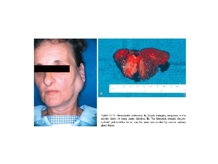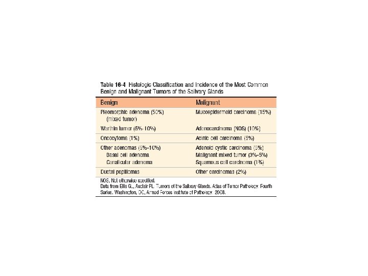 Neoplasms • • uncommon 65% to 80% arise within the parotid, 10% in the submandibular gland, and the remainder in the minor salivary glands. • 15% to 30% of tumors in the parotid glands are malignant. In contrast, approximately 40% of submandibular, 50% of minor salivary gland, and 70% to 90% of sublingual tumors are cancerous. Thus, the likelihood of a salivary gland tumor being malignant is more or less inversely proportional to the size of the gland.