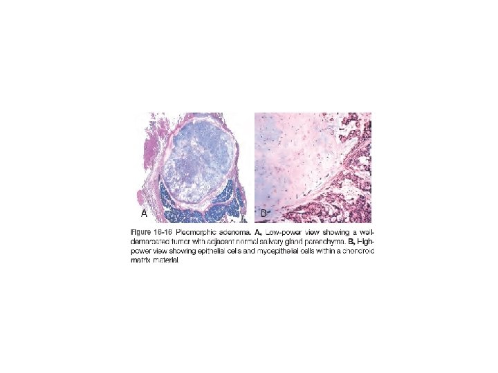 • carcinoma ex pleomorphic adenoma or a malignant mixed tumor: - A carcinoma arising in a pleomorphic adenoma - The incidence of malignant transformation increases with time, being about 2% for tumors present less than 5 years and almost 10% for those present for more than 15 years. - malignant mixed tumors are among the most aggressive of all salivary gland malignant neoplasms, producing mortality rates of 30% to 50% at 5 years.