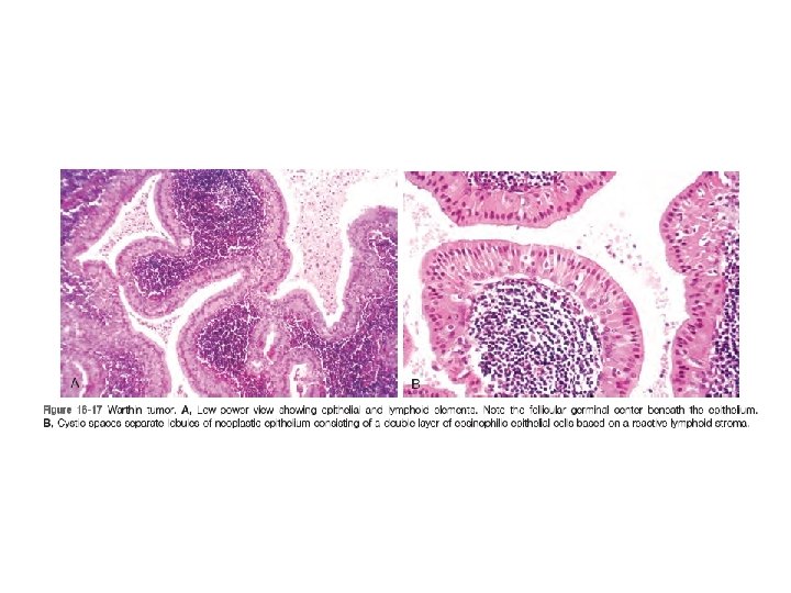 Warthin Tumor • • Papillary Cystadenoma Lymphomatosum. the second most common salivary gland neoplasm. arises almost exclusively in the parotid gland. Occurs more commonly in males than in females, usually in the fifth to seventh decades of life. 10% are multifocal 10% bilateral. Smokers have eight times the risk of nonsmokers for developing these tumors. These neoplasms are benign, with recurrence rates of only 2% after resection.