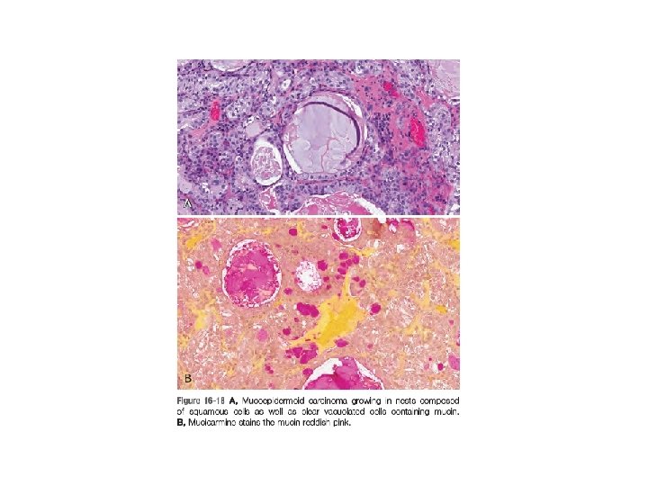 Mucoepidermoid Carcinoma • represent about 15% of all salivary gland tumors. • while they occur mainly (60% to 70%) in the parotids, they account for a large fraction of salivary gland neoplasms in the other glands, particularly the minor salivary glands. • The most common form of primary malignant tumor of the salivary glands. • t(11, 19) ------ MECT 1 , MAML 2 genes