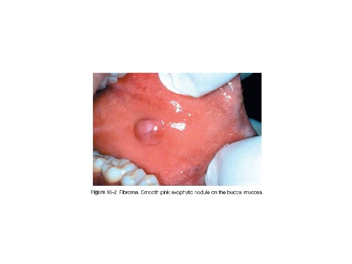 • irritation fibroma: - also called traumatic fibroma - occurs primarily on the buccal mucosa along the bite line or the gingiva - It is believed to be a reactive proliferation caused by repetitive trauma. - Treatment is complete surgical excision.