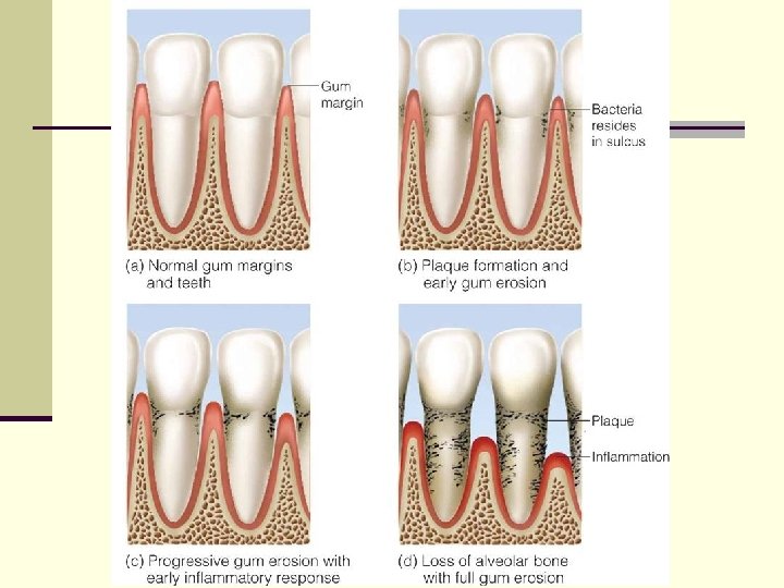 PATHOGENESIS n n n Poor oral hygiene Shift in bacterial flora; 300 different org Facultative gram positive organism – Healthy site Anaerobic gram negative microaerophilic organisms – Diseased site. Actinobacillus, Porphyromonas gingivalis, Provotella intermedia