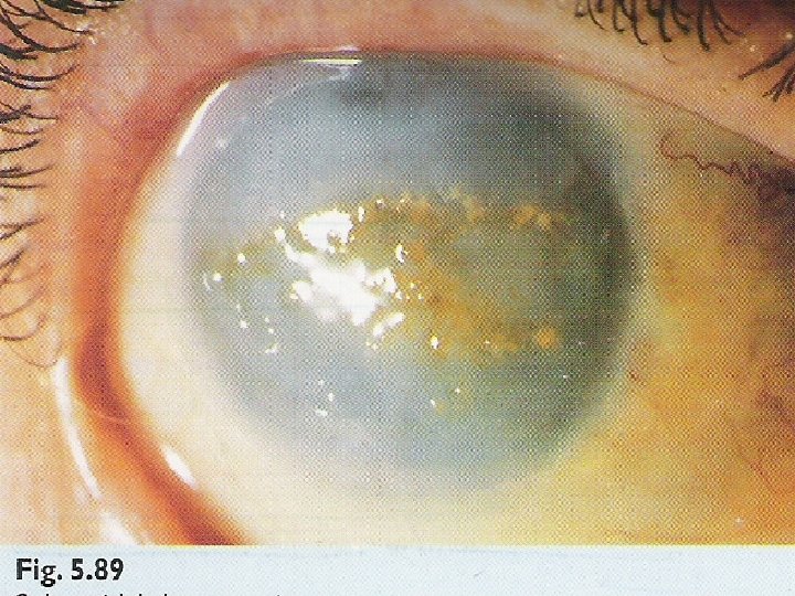 n n n - Age related - Metabolic – increase ca, CRF - Hereditary Peripheral inter-palpeberal calcification with clear cornea separating sharp peripheral margins of the band from the limbus Spread centrally to form band like chalky plaque Advance lesion – nodular & elevated with discomfort d/t epi. breakdown
