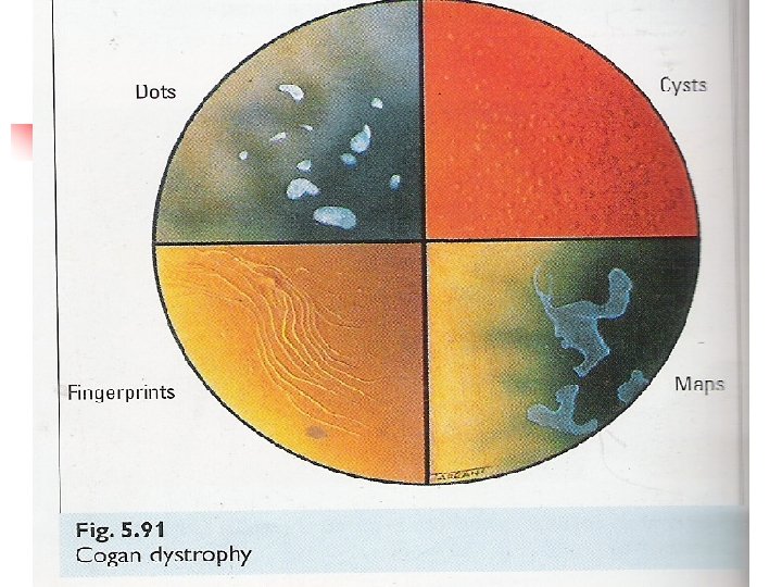 CORNEAL DYSTROPHIES n Anterior Cogans microcystic dystrophy Reis – Buckler § Stromal Granular Macular Lattice § Endothelial Fuchs endothelial dystrophy Posterior polymorphous dystrophy