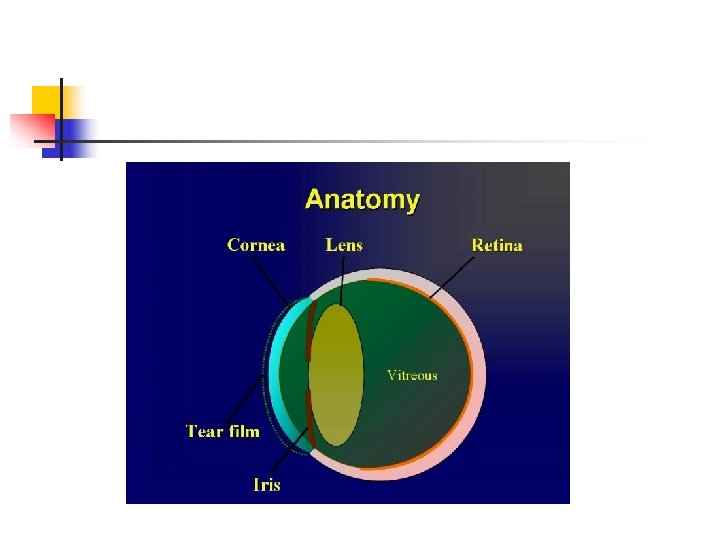 n n Thickness centre periphery Radius of curvature ant. surface post surface Refractive index 0. 5 -0. 6 (thinner) 0. 7 -1. 0 mm 7. 8 mm 6. 5 mm (steeper) 1. 376 Refractive power - 40 -44 D (70% Of total refractive power of the eye