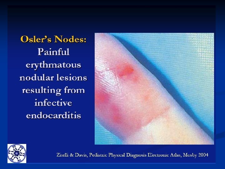 IV. Skin n n lesions: Splinter hemorrhage and Osler’s nodes. These appear as small raised painful nodules, mainly in the extremities. They were thought to be embolic but now regarded as toxic or allergic vasculitis. Clubbing of the fingers