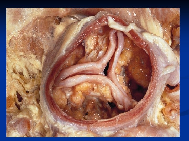 Microscopically: n The cusps become thickened, distorted, vascularized throughout. n It consists of dense fibrous tissue which may be infiltrated by lymphocytes and plasma cells. n In some cases the cusps may be irregularly calcified. n Effects: n Left atial hypertrophy is very limited. n It follows by left atrial enlargement and dilatation. n Atrial fibrillation (AF) is common, but the n