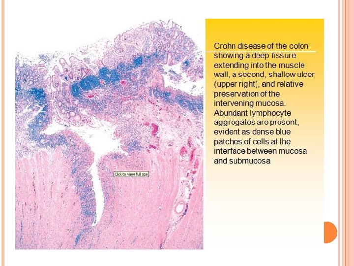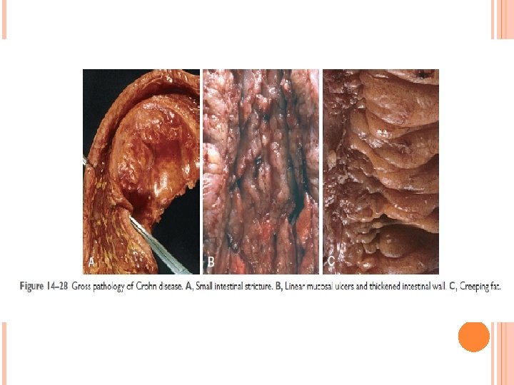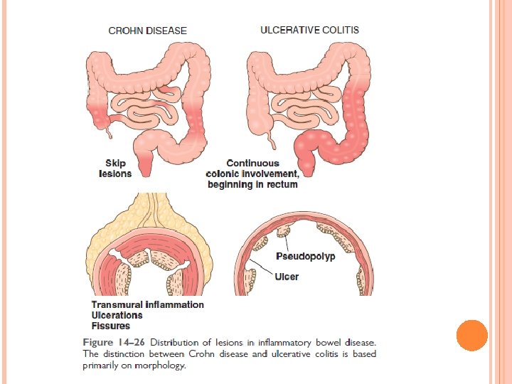 MORPHOLOGY OF CROHN DISEASE � The most common sites involved by Crohn disease at presentation are the terminal ileum, ileocecal valve, and cecum. � The presence of multiple, separate, sharply delineated areas of disease, resulting in skip lesions, is characteristic of Crohn disease. Strictures are common. Sparing of interspersed mucosa results in a coarsely textured, cobblestone appearance in which diseased tissue is depressed below the level of normal mucosa. Fissures frequently develop between mucosal folds and may extend deeply to become sites of perforation or fistula tracts. The intestinal wall is thickened. . In cases with extensive transmural disease, mesenteric fat frequently extends around the serosal surface (creeping fat). � � �