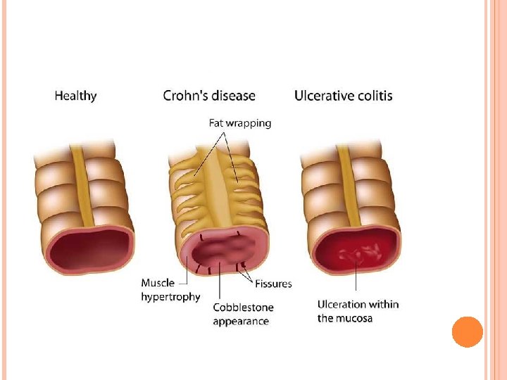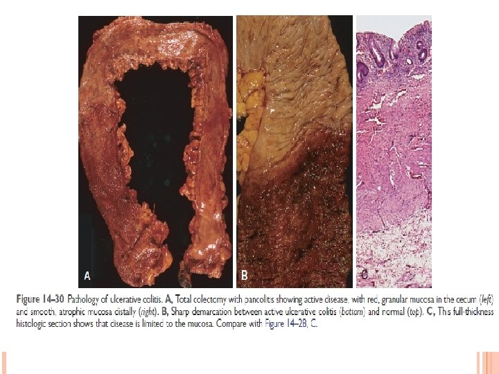 ULCERATIVE COLITIS � Ulcerative colitis is closely related to Crohn disease. � However, ulcerative colitis is limited to the colon and rectum. � Some extraintestinal manifestations of ulcerative colitis overlap with those of Crohn disease, including migratory polyarthritis, sacroiliitis, ankylosing spondylitis, uveitis, skin lesions, pericholangitis, and primary sclerosing cholangitis.