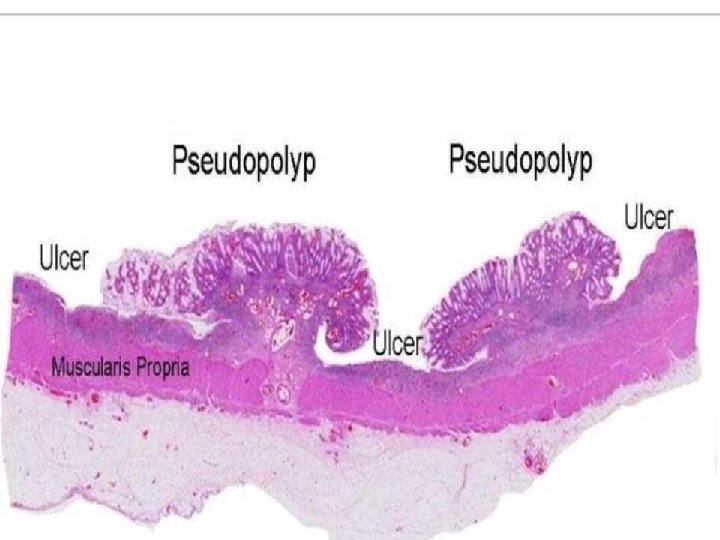 �MICROSCOPIC: �Inflammatory infiltrates �Crypt abscesses �Crypt distortion �Epithelial metaplasia �Submucosal fibrosis �Inflammation limited to mucosa and submucosa. �No skip lesions �No granulomas.