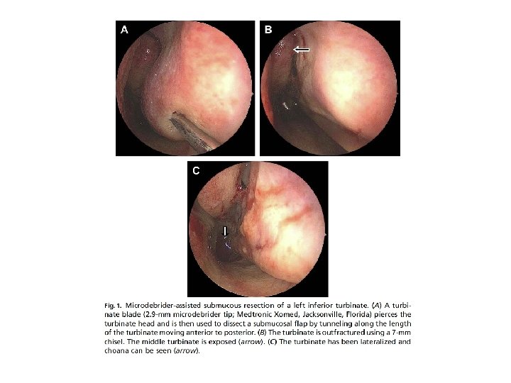 Surgical Reduction of the Inferior Turbinates ü Turbinate resection, total or partial ü Outfracturing of the inferior turbinate ü Destructive procedures, including electrocautery, cryosurgery, laser surgery, and submucous resection