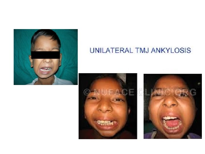 The problems associated with TMJ Ankylosis Functional – Restricted jaw movements – `Inadequate masticatory function – `Restricted mouth opening – `Inhibited facial and physical growth – `Impaired speech • Aesthetic (Cosmetic), – Reduced growth of mandible resulting in micrognathia & “Bird Face” – Facial asymmetry if only one side is affected – Deviation of jaw to ankylosed side – Malaligned teeth because of lack of space for the eruption of the normal component of teeth, Increased over jet • Other emotional, social and psychological disturbances